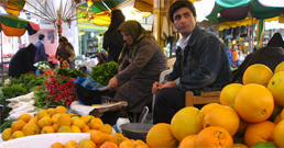 فروشندهها در بازار رضوان بیشتر زنانی هستند که از روستا صبح زود به سمت شهر میآیند، تا حاصل دست یا محصول باغشان را بفروشند.